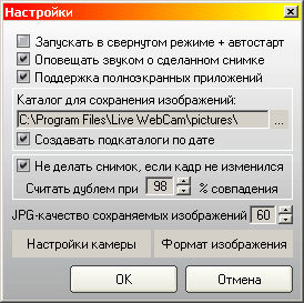 % совпадения - процент совпадения предыдущего и текущего кадров, при котором программа считает снимки идентичными. Практика показала, что значение в 98% полностью компенсирует шум матрицы дешевых вебкамер при недостаточном освещении (а также погрешности JPG-сжатия драйвера камеры), и в то же время, позволяет надежно отслеживать даже незначительные изменения в кадре. Если у Вас хорошая вебкамера, либо Вы используете цифровой фотоаппарат в режиме вебкамеры, можно установить значение в 100%, т.к. на таких устройствах матрица практически не "шумит". Рекомендуется подобрать процент соответствия опытным путем под конкретное устройство захвата изображений, а также желаемую чувствительность программы.