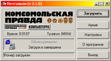 Единственная в своем роде программа "Почтальон" предназначена для загрузки, обработки, индексации и сохранения любого номера газеты "Комсомольская правда" напрямую с сайта.